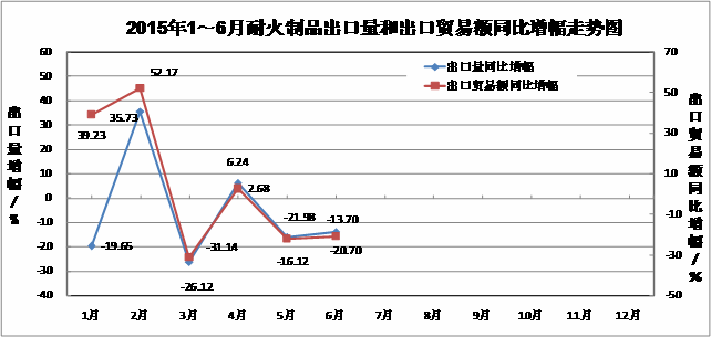 In 1~6 months, the export volume of refractory products decreased by 9.63% compared to the same period last year. Among them, the export volume of Al-Si refractories and other refractories increased by 2.56% and 13.35% respectively, while that of alkaline products decreased by 21.30%.