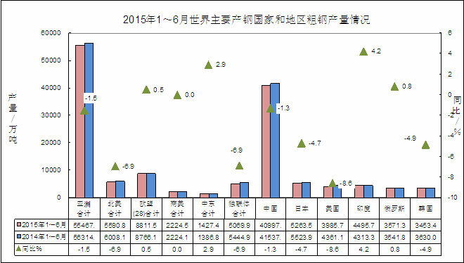 In 1~6 months, global (65 countries and regions) total crude steel output was 8.13 million tons, down 2% compared with the same period last year. Except for the 28 countries in the European Union and the Middle East, the growth rate is 0.5% and 2.9% respectively.